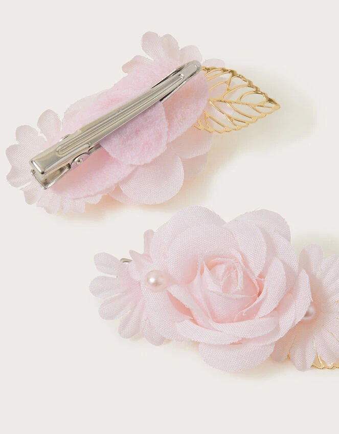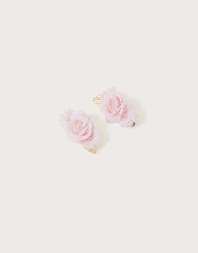 Decorated with pearlescent beads, these hair clips add a little touch of luxury into party looks. Sat on a salon clip base, they feature ruffled pink flowers alongside a gold leaf detail.