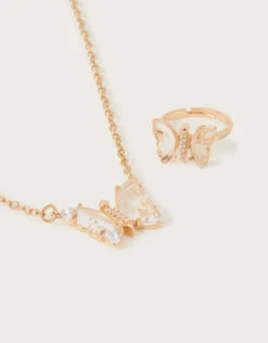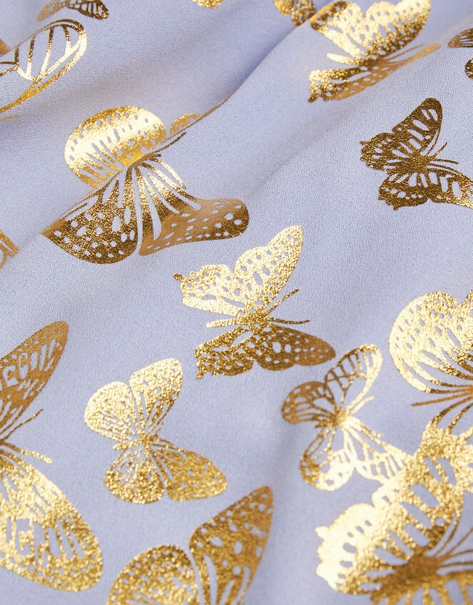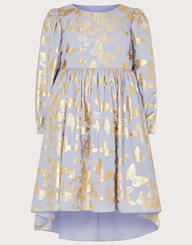 Scattered with a kaleidoscope of butterflies, this sweet dress features a gold foil print on a lilac casting. Perfect for their first season of parties, this dress features long blouson sleeves, with a dipped hemline and zip fastening on the reverse.