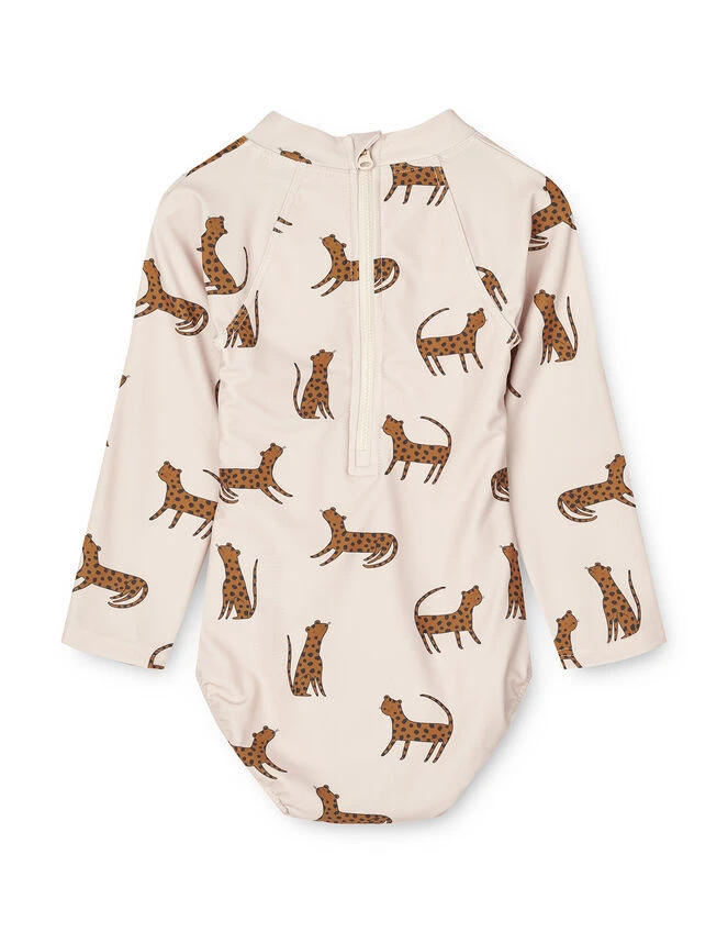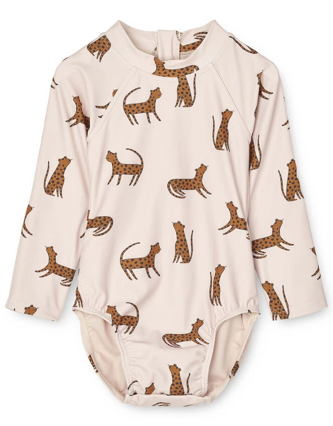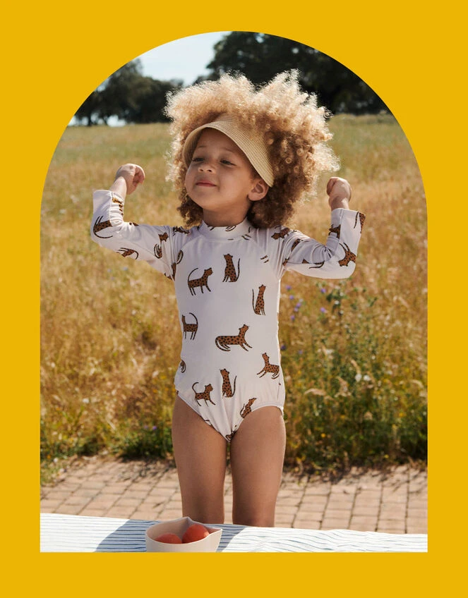 Keep your cubs cool, comfortable and protected under the sun in the Maxime swimsuit for babies. Finished in an illustrative leopard print they’ll love, it provides coverage from harsh midday rays with long sleeves, a high neck, fully covered tummy area and briefs.