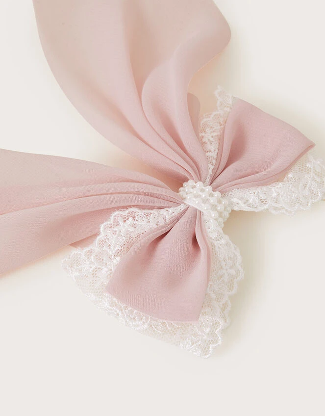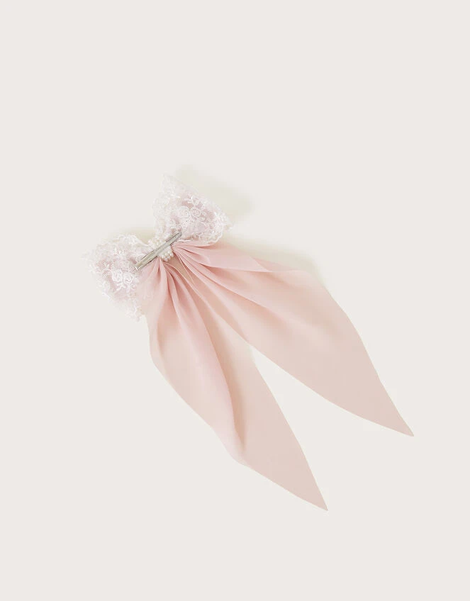 The prettiest pink bow to clip above their half-up half-down hairstyle, this piece is bordered with lace trims and a diamante centre. Built upon a metal salon clip.
