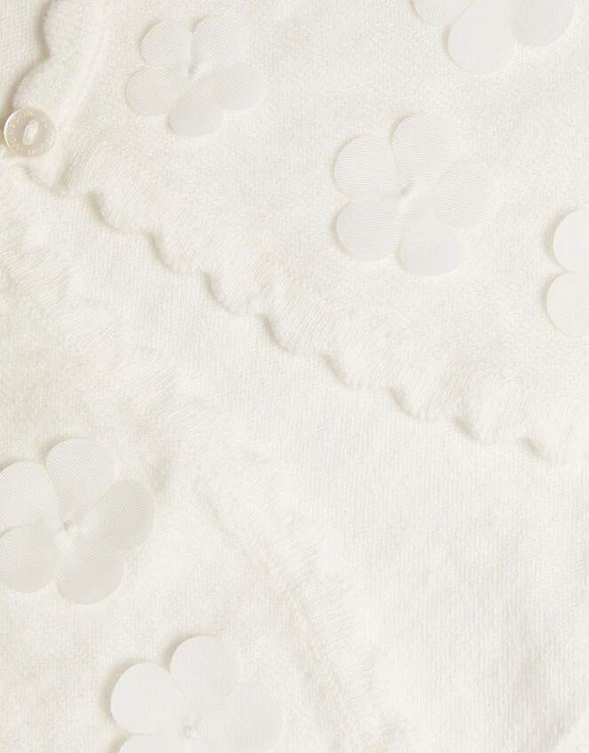 The most adorable top layer to their occasion dresses, this cardigan sits cropped with an open front to allow their outfit to peer through underneath. Spun in lightweight cotton, it features fabric flowers over the front and scallop trims for a pretty finish. Fastens with a single button. Ivory