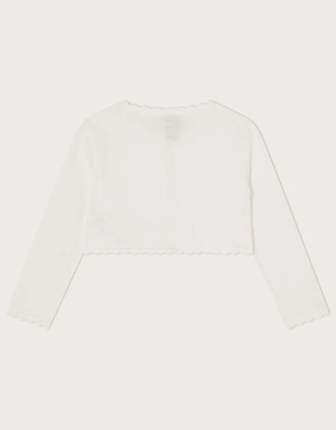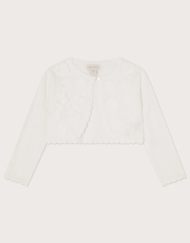 The most adorable top layer to their occasion dresses, this cardigan sits cropped with an open front to allow their outfit to peer through underneath. Spun in lightweight cotton, it features fabric flowers over the front and scallop trims for a pretty finish. Fastens with a single button. Ivory