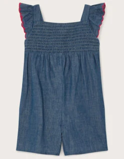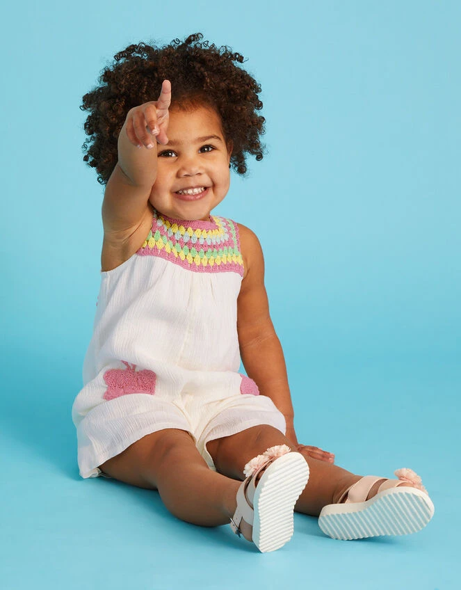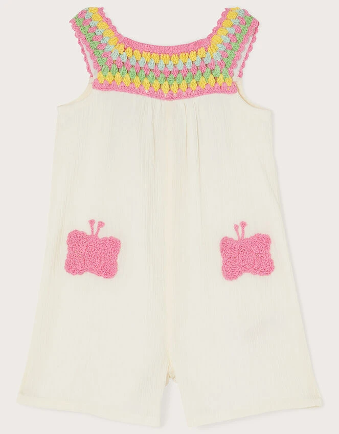 The comfiest piece for pottering around in the garden, this romper features a colourful crochet neckline with matching butterflies to the front and back. Fastens on the reverse with a button.