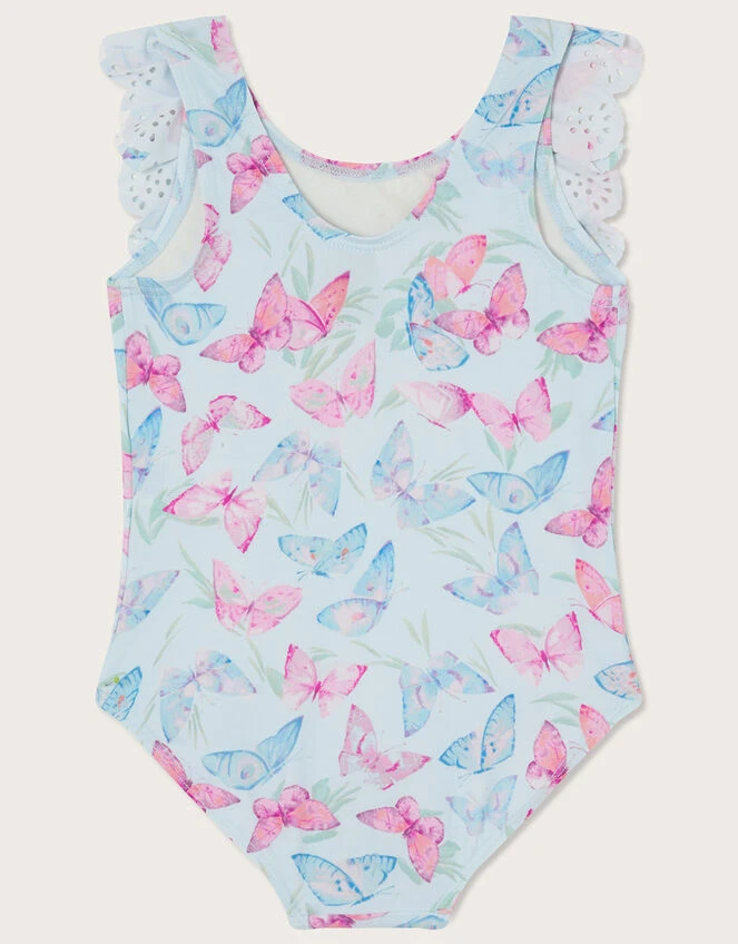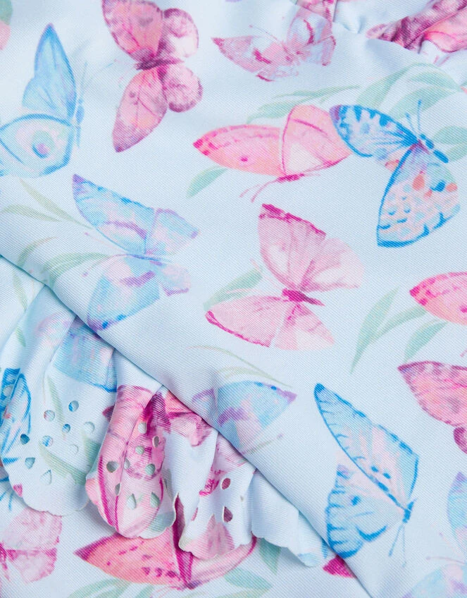 A kaleidoscope of butterflies flutter across this swimsuit, ready to take on the slides. It’s crafted in a stretchy swim fabric, with laser cut frills to the shoulders for a pretty touch.