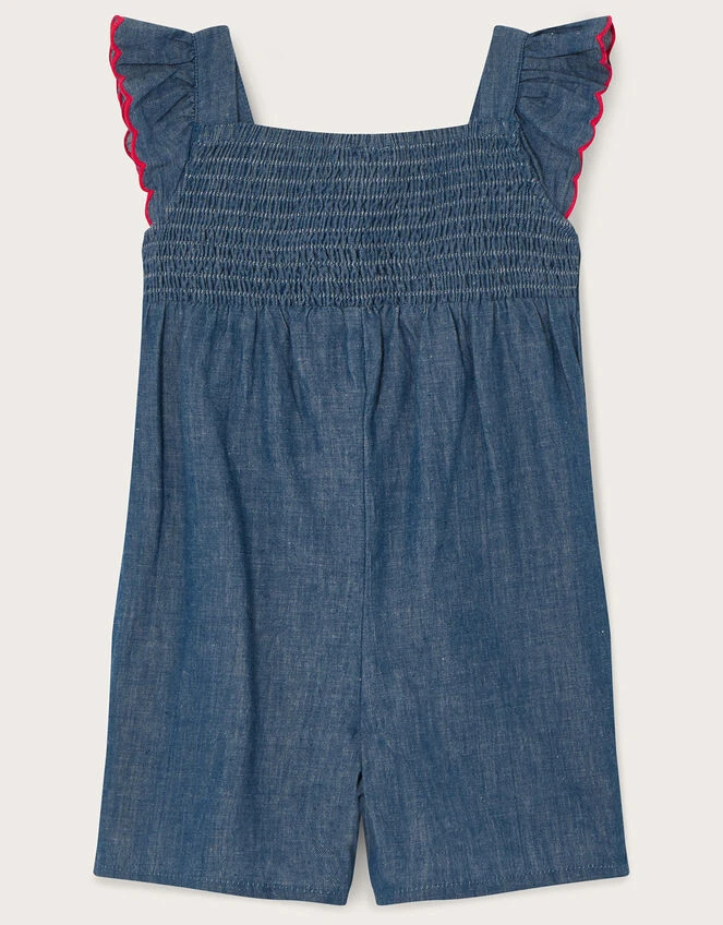 Spun in lighter-than-air chambray that’ll dry extra quick after a few trips through the sprinkler, summer days in the garden have never been breezier! Cut in a romper silhouette, the bodice is shirred for comfort with neon stitching that adds a pop of colour that transcends into the ruffle shoulders – take a closer look and find some friendly flamingos to the front!
