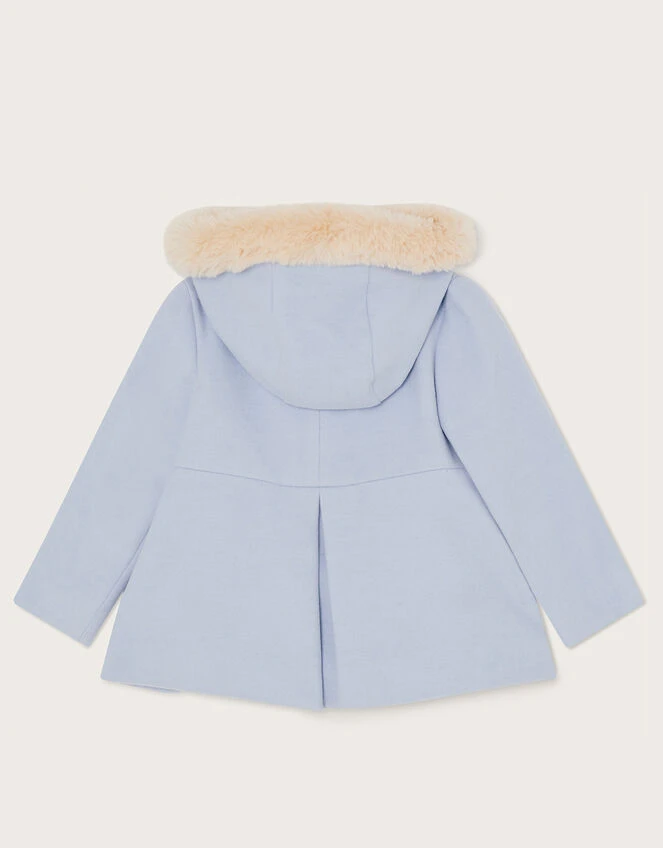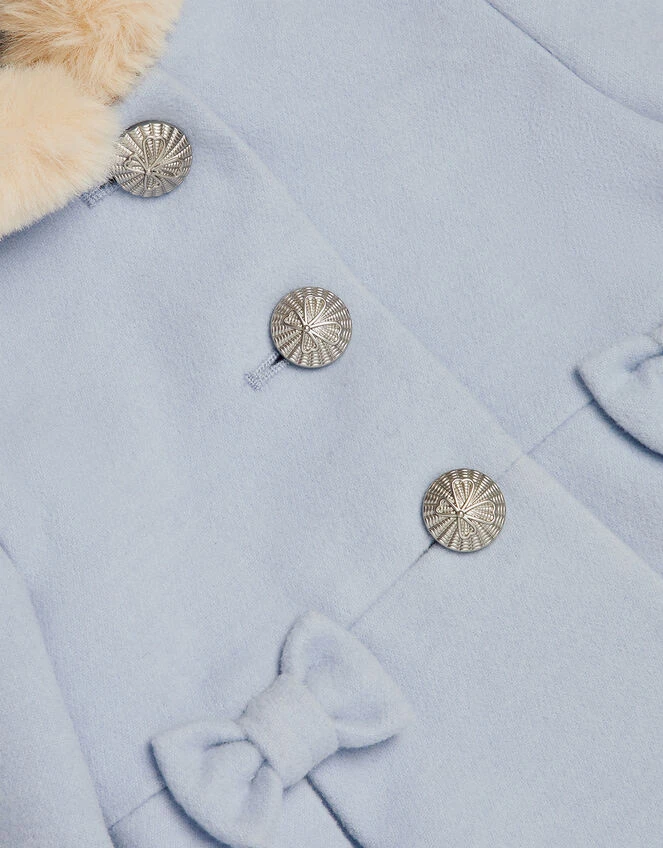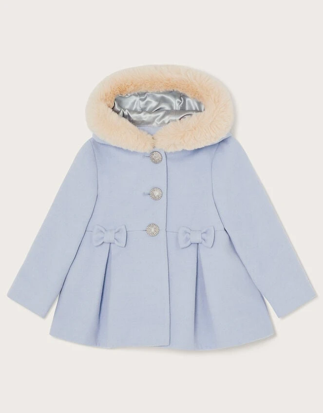 Wrap little ones up on frosty special occasions with this coat, finished with an icy blue backdrop. It’s soft and durable to keep the cold out, cut in a swing silhouette with bow detailing and a faux fur trim hood. Blue