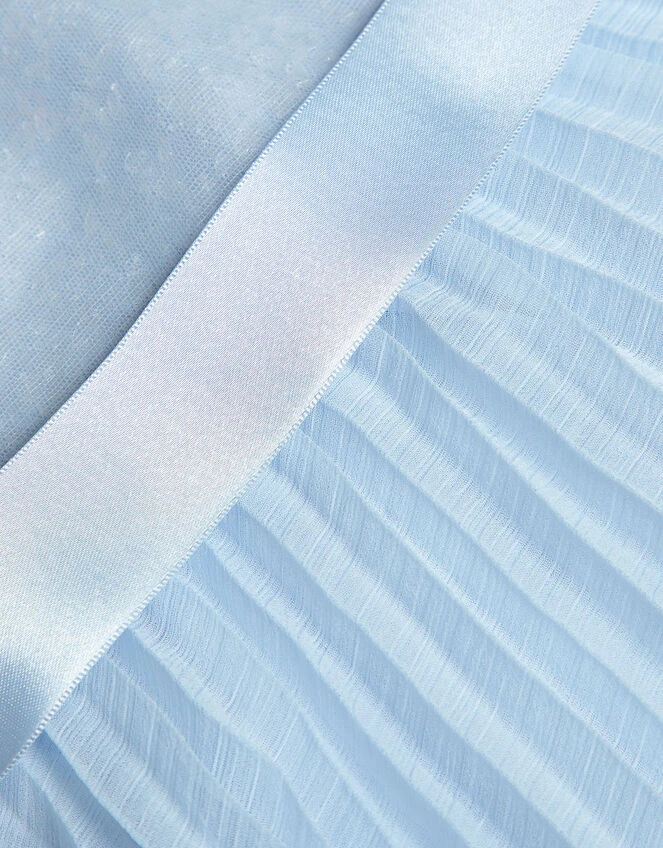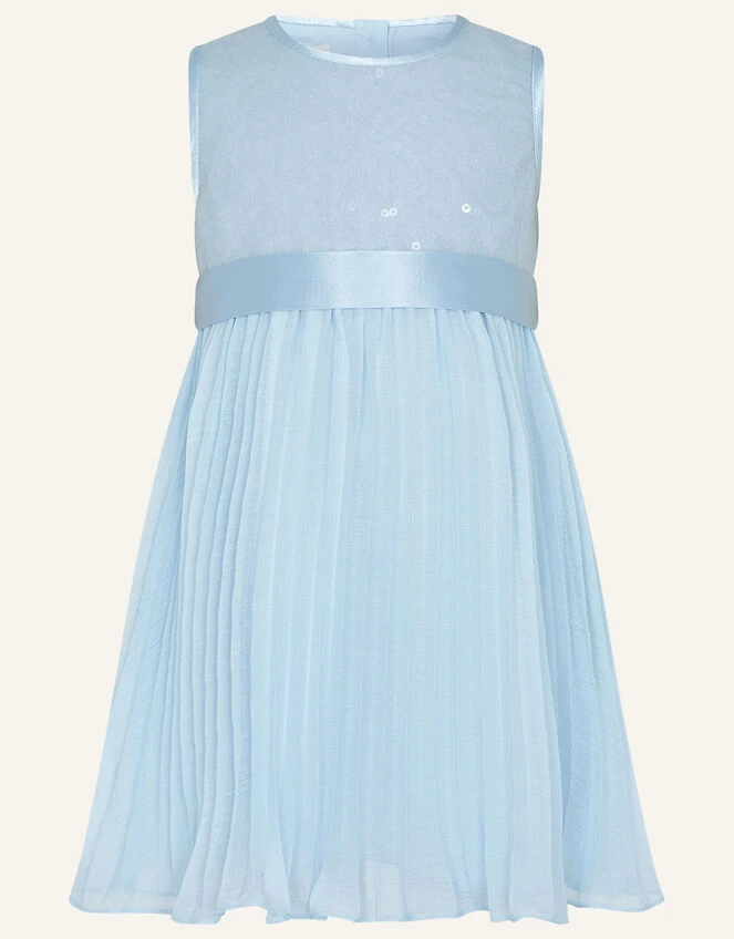 Finished in a soft baby blue hue, this dress includes a sleeveless bodice embellished with sequins, and a glossy ribbon to the waist. The pleated skirt flares softly into an A-line cut, making it the perfect dress for swirling and twirling in! Fastens to the reverse with buttons. Blue