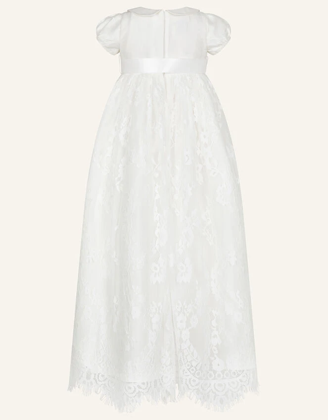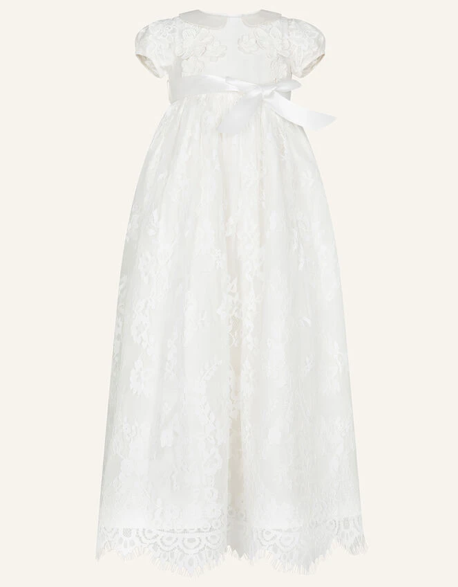 Make her Christening feel truly special with our picture-perfect Provenza gown. Crafted in luxurious silk and laden with vintage-inspired lace, this long design features a rounded collar and pretty ribbon sash. It is fully lined, and fastens with concealed buttons. Ivory