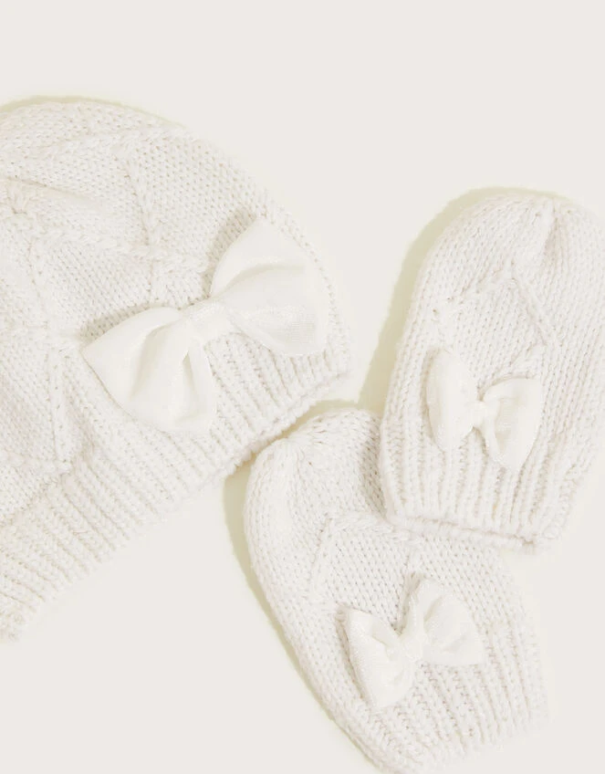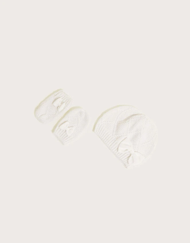 Keep your little one snuggled up in a warm, cosy cocoon during essential winter outings with this beanie and mitten set on. Designed in an ivory knit, it’s finished with stretchy ribbed trims for comfort and a bow for a sweet touch. Ivory