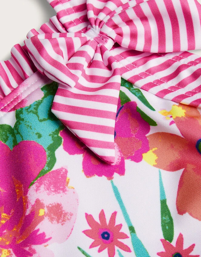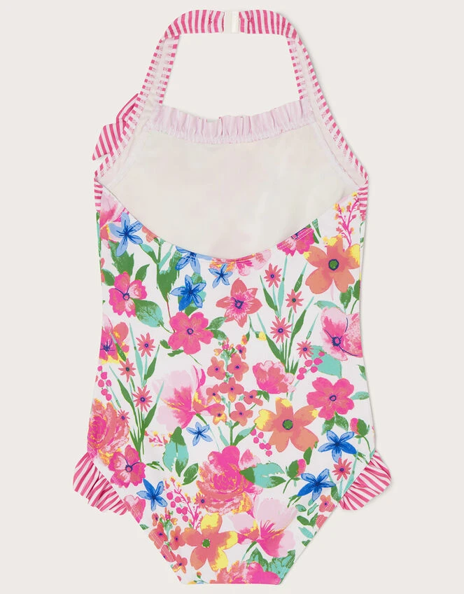 Vibrant botanicals and flora bloom through this swimsuit, featuring pink-and-white stripe trims for a contrast finish. Designed in stretchy swim fabric, it has a comfortable fit thanks to the halterneck and brief bottoms, finished with a skirted hem.