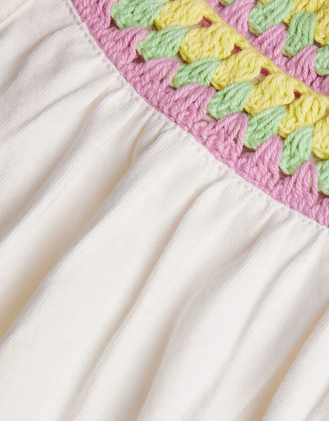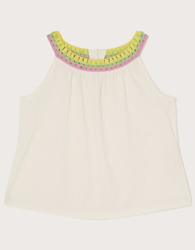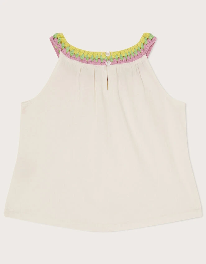 We’ve added summery textures and pastel hues to this simple cami top, creating a fun piece to style every day of summer. It features a crochet neckline with lemon, green and lilac stripes for a splash of colour, before flaring out into a loose fit over the tummy. Designed in better-sourced cotton, it fastens on the back of the neck with buttons.