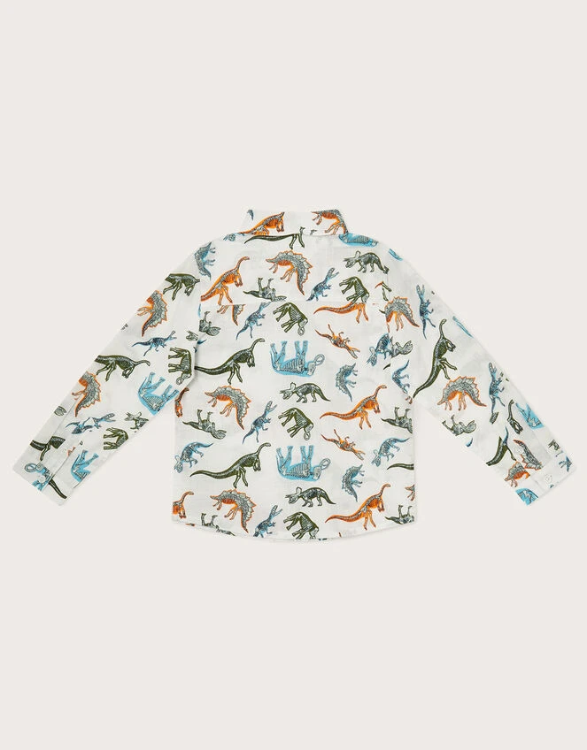 Spun in soft cotton ready for summer garden parties, this shirt is perfect for infusing some adventure into their smarter outfits. Finished with a structured collar, button through fastening and long sleeves, this shirt is roaming with with an all-over dinosaur skeleton print. Ivory