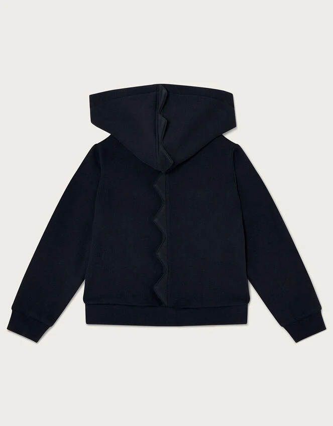 Keeping it cool and casual, this denim jacket is designed in a silhouette that gives a sleeveless jacket and hoodie illusion. The hood features threaded drawstring tassels, keeping them out of little one’s mouths. The button through fastening will keep them warm on outdoor adventures, finished with a little scaley dinosaur friend to the front. Blue