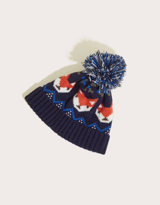 Making winter dressing a little more fun, this beanie hat features fiery foxes. Designed in soft knit navy fabric with ribbed trims, of course we had to finish things off with a pom-pom to the top. Blue