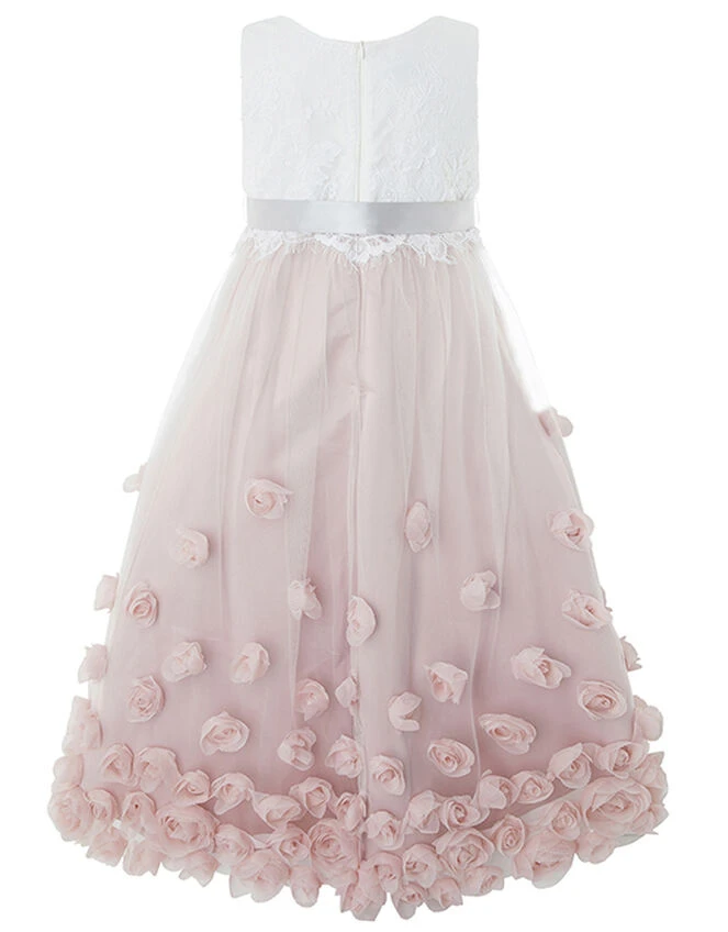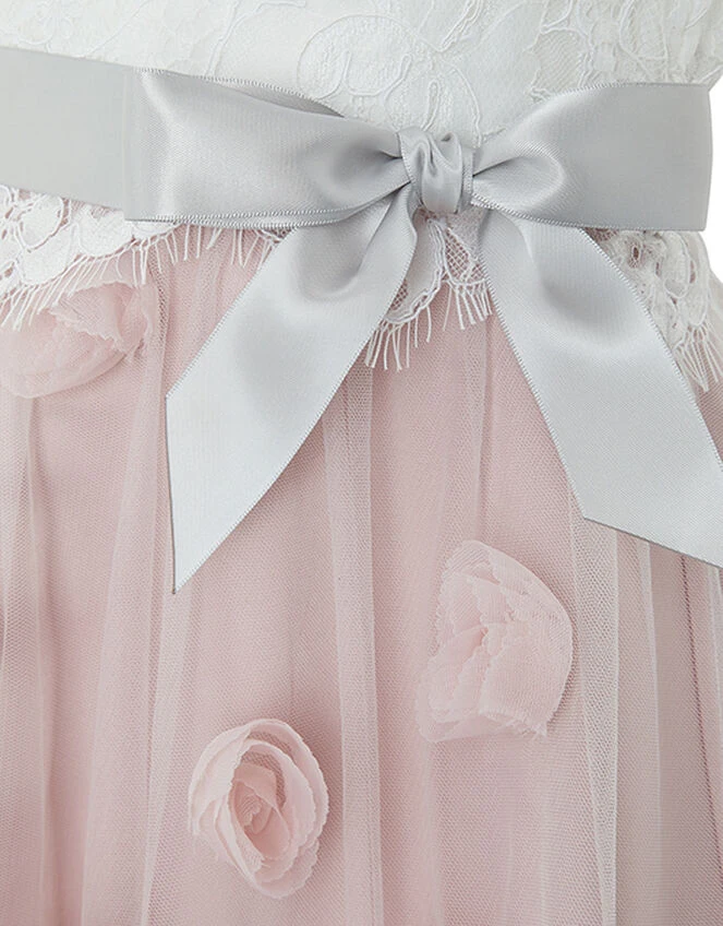 Our Ianthe dress is layered with tulle and decorated with beautiful 3D flower appliqués – the perfect piece for a wedding or special birthday. The bodice is a delicate floral lace and there’s a glossy ribbon waist belt to tie in a bow. Ianthe is fully lined and washable for easy care. Pink