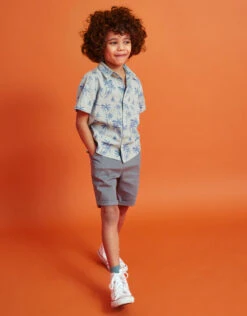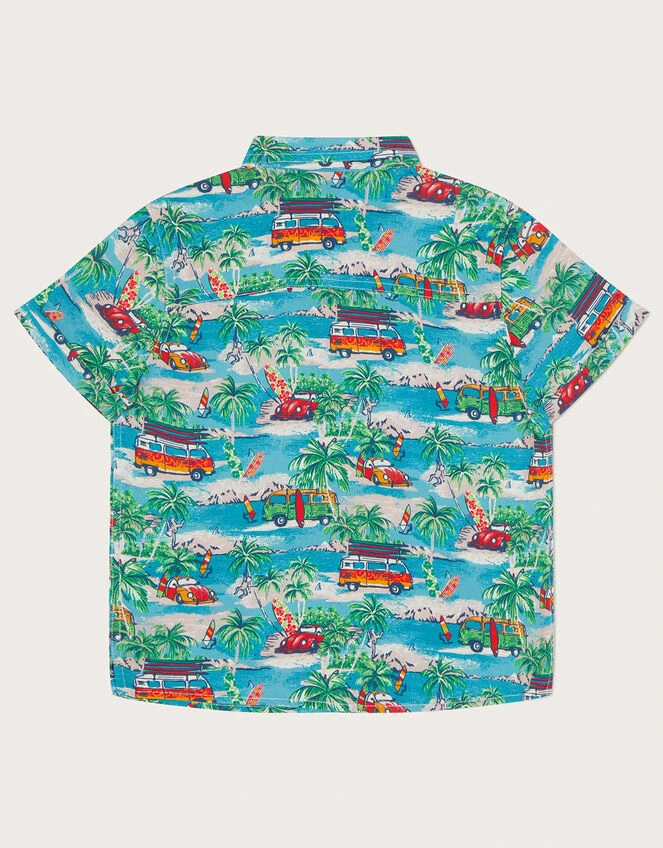 Campervan chaos: this shirt features palm trees, surf boards and vintage campervans, ensuring it pops when little ones style it alongside their chino shorts. Designed in airy cotton, it falls into a relaxed fit with a point collar and button through placket. Blue