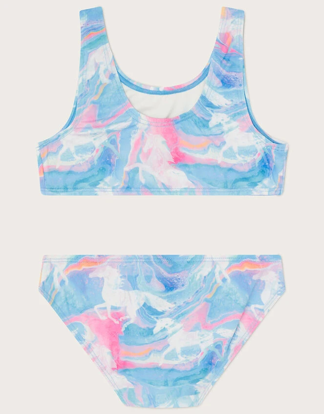 Unicorns emerge and disappear amongst the dreamy marble blend on this bikini set. Doused in a magical colour palette, it features a comfortable scoop neck bikini top with brief bottoms to match. Style under one of our playsuits for coverage to-and-from the ice-cream hut.