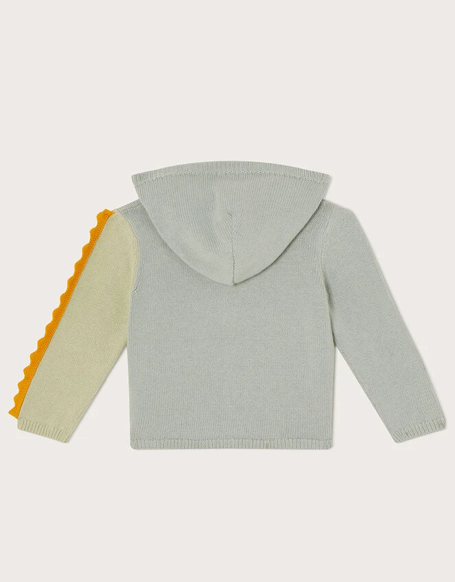 Climbing up the left arm, this friendly crocodile will keep your little one company with its soft 3d spikes and bright embroidered teeth. Knit in grey cotton, it features a button through front, pocket detail and the best part – a cosy hood for extra warmth!