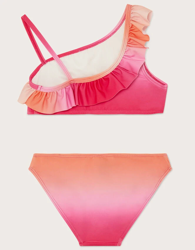 A dreamy blend in a fiery palette, this swimsuit combines the best of both worlds! Ideal for summer holidays, this set features an asymmetrical bikini top with a frill detail, and bikini briefs to match. Finish the look with sunglasses, sandals and sun cream of course!