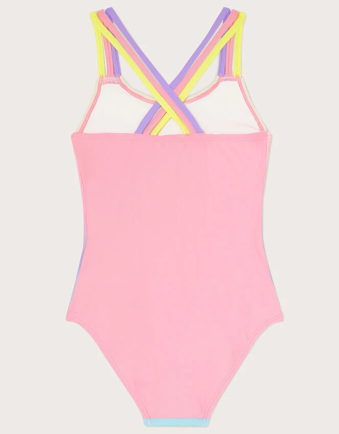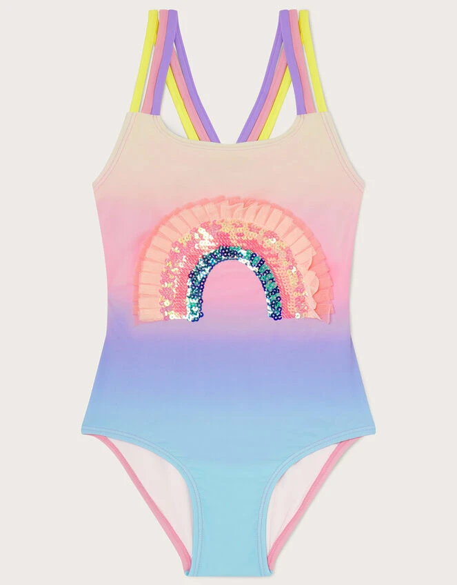Designed with a 3D rainbow appliqué to the front, this swimsuit will ensure bright and beautiful trips to the swimming pool or beach for summers to come. Crafted with stretchy swim fabric, the backdrop boasts a super-fun ombre backdrop, with triple straps and crossover detailing to the back.