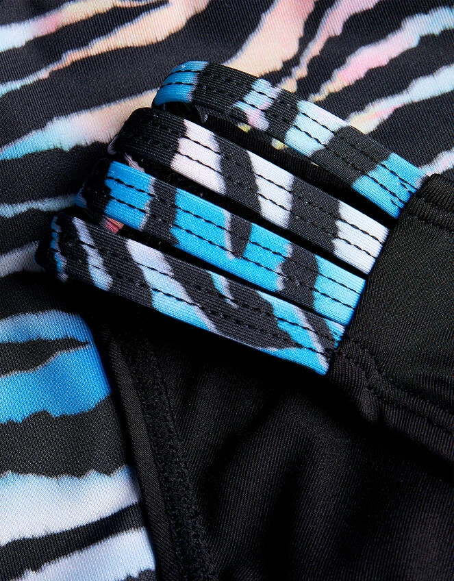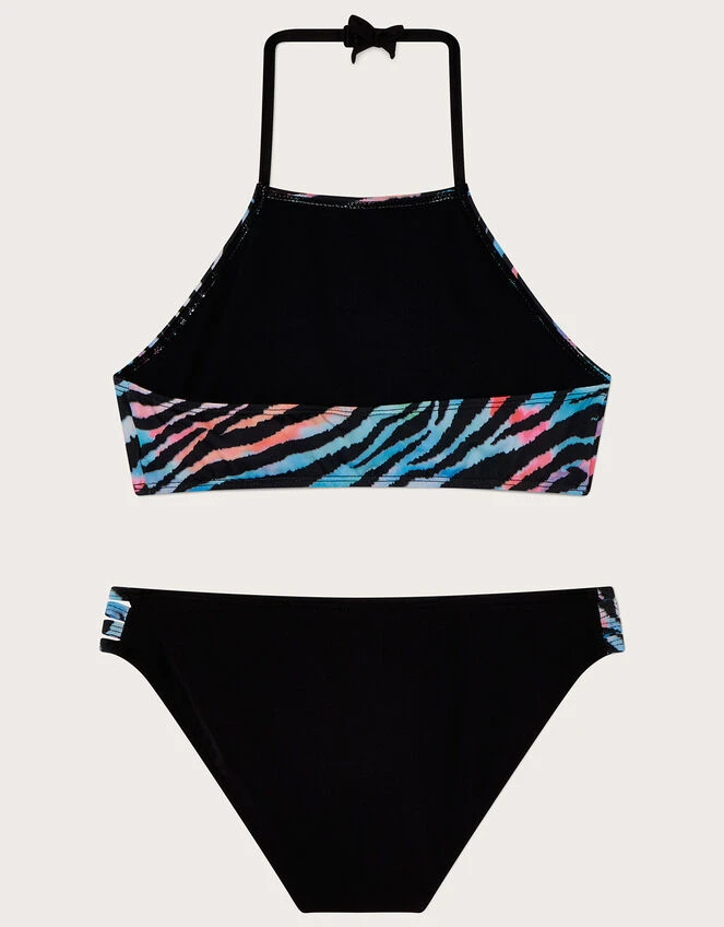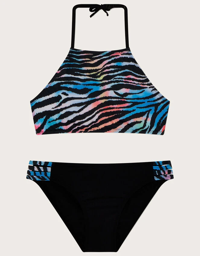 Not into bright colours? We’ve got just the piece. This bikini set features a black backdrop, with flashes of ombre zebra print for a touch of fun detailing. Matching bikini bottoms included.