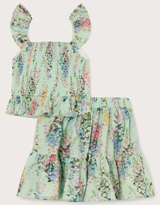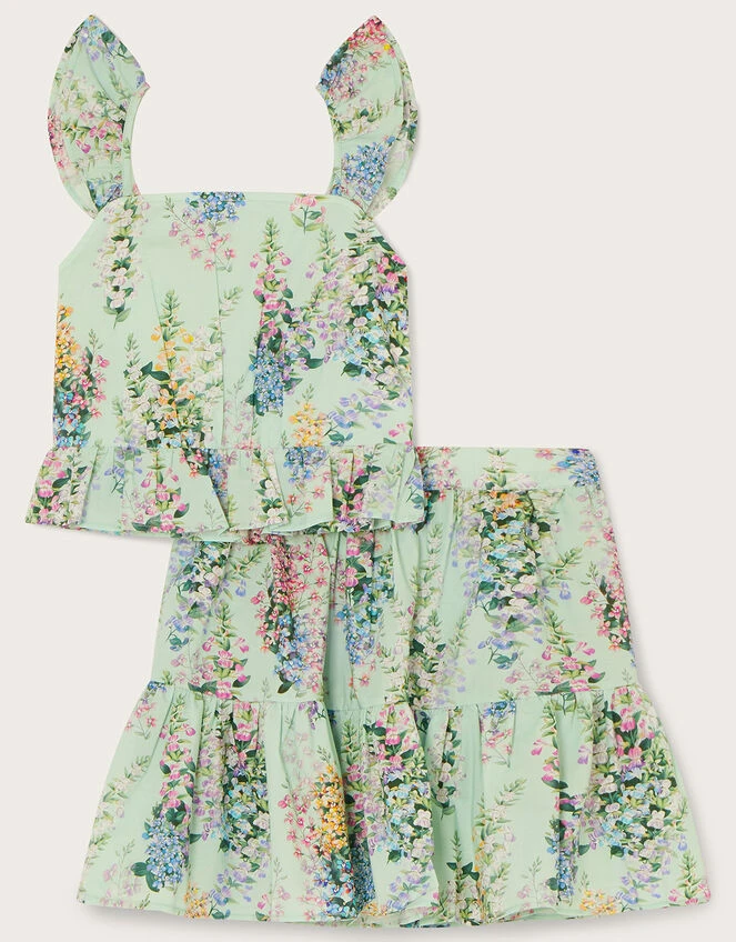 Daytime fun is found within the spring florals and pastel palette on this set. Cast in a sage hue, both pieces are finished with a pleated hem, whilst the top includes frill straps and a stretch shirred panel on the reverse. Style with ballet flats and a cosy cardigan to complete the look. Multi