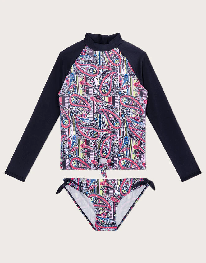 Little ones will love trips to the seaside with this protective set on. Its vibrant paisley print makes them easy to spot amongst busy crowds, whilst the long sleeves and high neck keeps them safe from the sun. This soft swim duo is designed to provide protection against ultraviolet solar radiation. It has been independently tested and achieved a UPF rating of 50+.