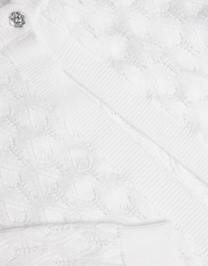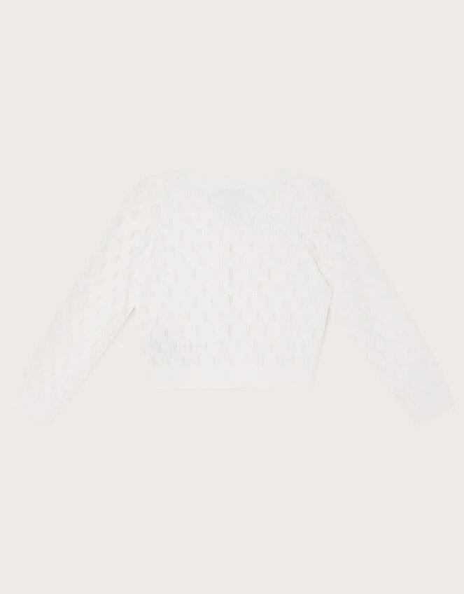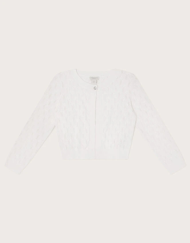 Breathable yet cosy, opt for this knit cardigan with pointelle stitching to keep your littlest warm this season. Crafted in ivory fabric, it’s the perfect piece to layer over dresses with an open front design that fastens with one button to the neck. Finished with ribbed trims.