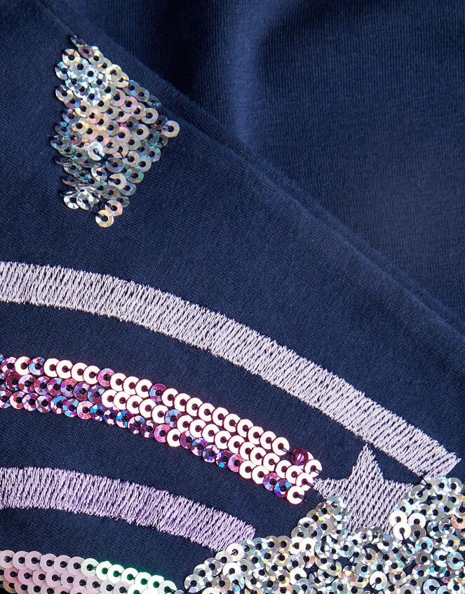 A sparkly update on a comfy and classic style, these soft leggings feature a colourful sequin rainbow and sunray design to the legs.
