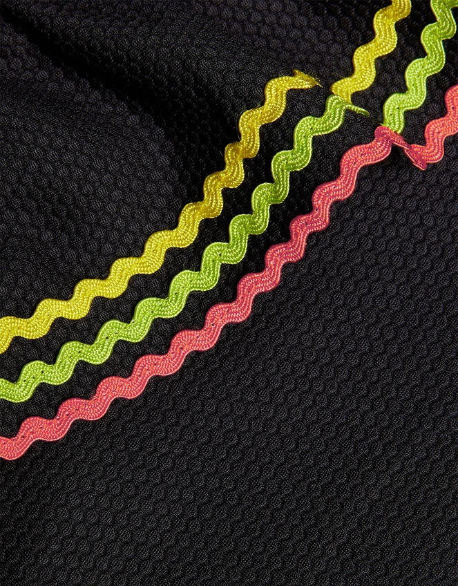 A simple black swimsuit with a playful twist, take a closer peek at this piece to see the multi-coloured ricrac detailing. Designed in stretchy swim fabric, it has a textured finish and asymmetric straps, with a brief cut on the bottom for comfort as they splash around for hours.