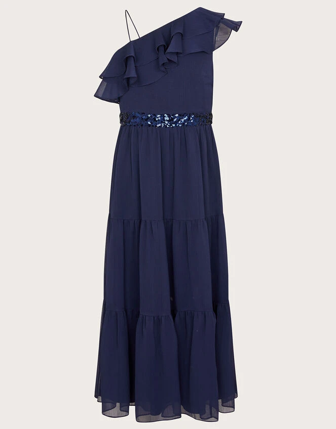 This one shoulder piece is ideal for summer parties. Featuring a Grecian-style ruffle bodice that transitions into a flowy, tiered skirt, it’s perfect for catching the summer breeze.