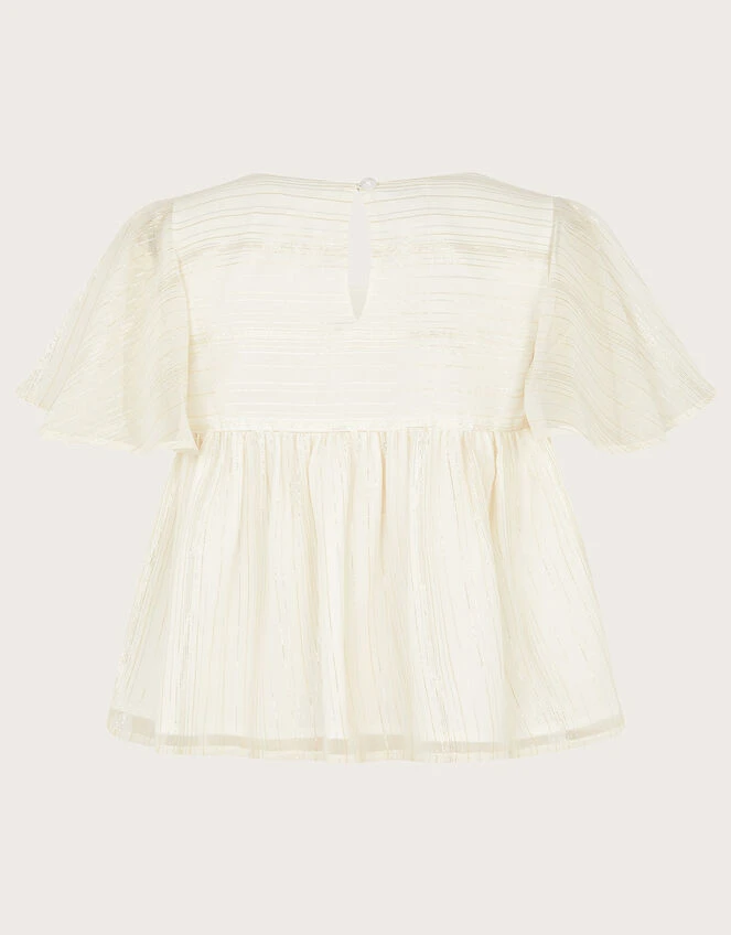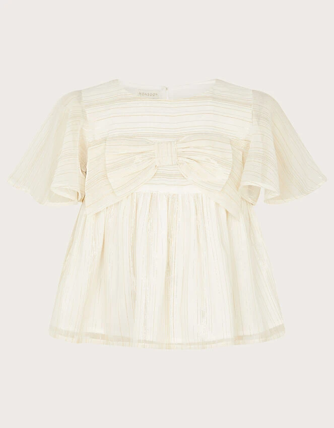 Featuring all things pretty, this top is as dainty and delicate as they come. It features the wispiest of flutter sleeves, with a sweet bow to the front. Woven through the fabric is golden pinstripes for a touch of sparkle, with a flared bodice for an angelic finish.