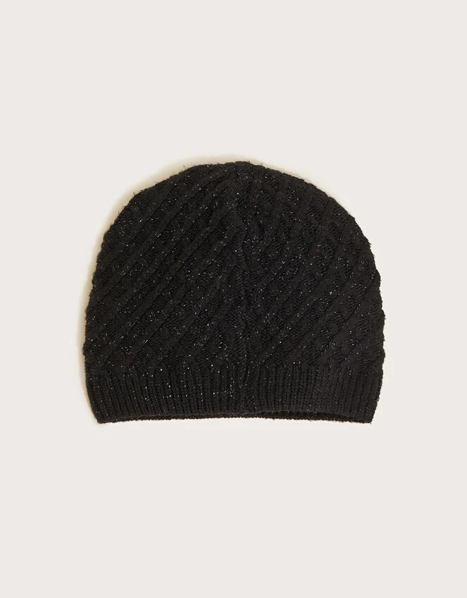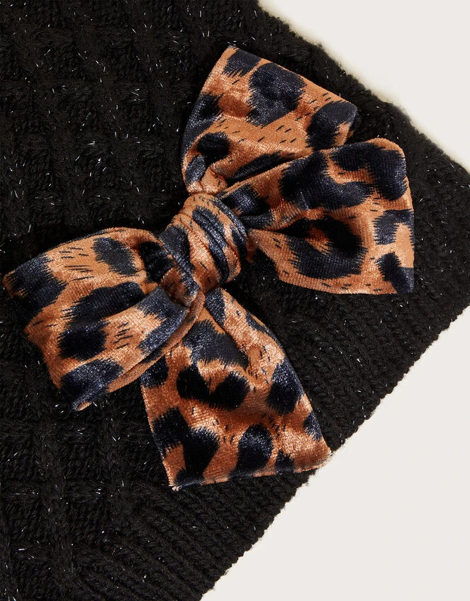 Taking the beanie hat to the next level, this style features a velvet leopard print bow to make a playful accessory in their winter edit. Designed in cable knit with a ribbed trim, it features metallic thread running throughout for that special sparkly finish.