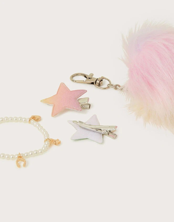 Something for every one of their party guests, little ones won’t be able to wait to open this gift bag up! Sat in a tie dye bag, they’ll find a fluffy rainbow keyring, charm bracelet and starry hair clips inside.