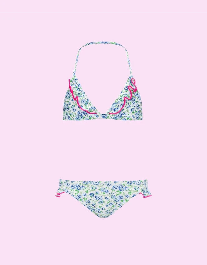 Ditsy, vintage florals make this bikini set an adorable option to lay out on the morning of beach day. It features a classic triangle cut bikini top and matching brief bottoms – all finished with frilly details and neon trims for a playful touch.