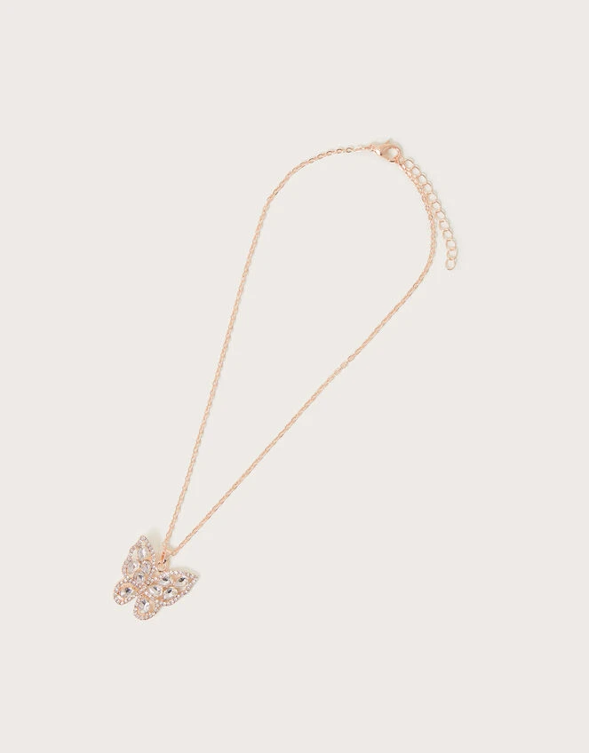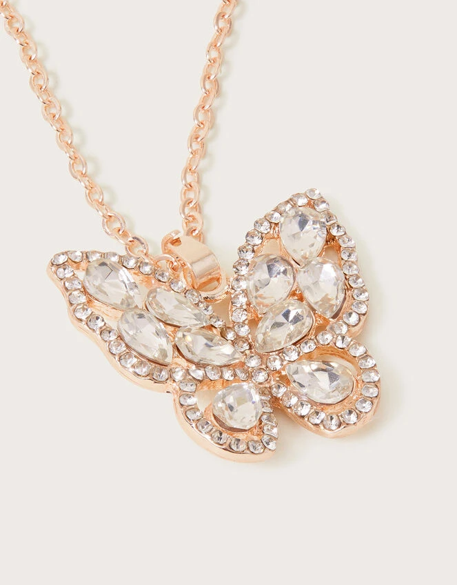 Designed to dazzle, this necklace is drenched in diamantes. It features a large butterfly pendant, ideal to pair with party dresses. Matching ring and bracelet available.